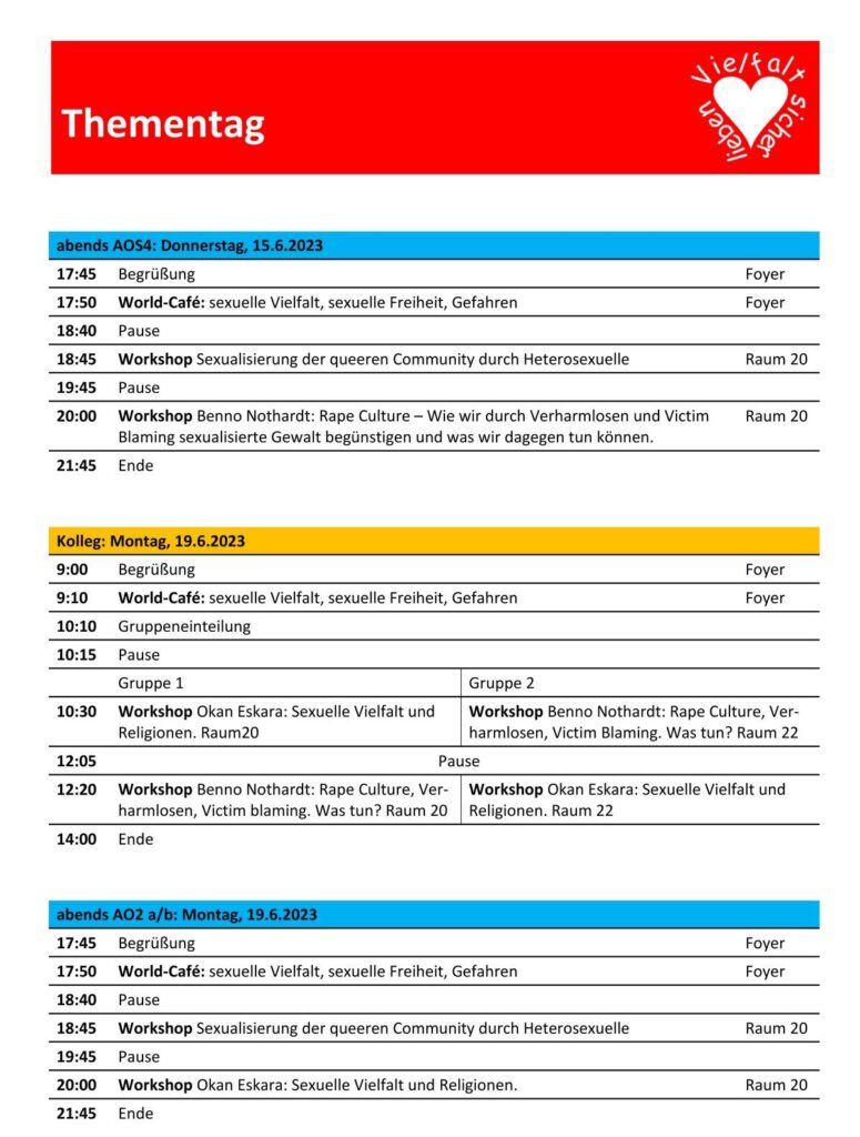 Seit dem Schuljahr 2020/21werden die Schuljahre jeweils mit einem Thementag beendet, an dem Studierende und Lehrkräfte zusammen noch einmal mit viel Begeisterung an einem gesellschaftlich wichtigen Thema arbeiten. Dieses Jahr steht der Thementag unter dem Motto Vielfalt – sicher – lieben. Wir verbinden die Themen Vielfalt, Liebe und Sicherheit : Einerseits sprechen wir über selbstbestimmte […]