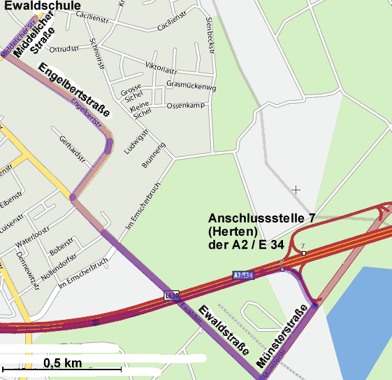 Kurz vor der A2 links für ca. 1 km auf die Ewaldstr.