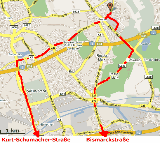 -> Yahoo-Routenplaner (Middelicher Straße 289, Gelsenkirchen als Ziel eingeben)