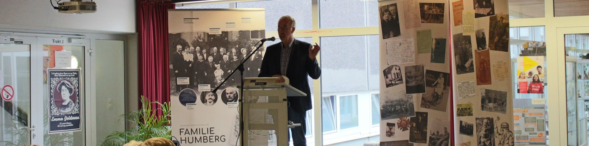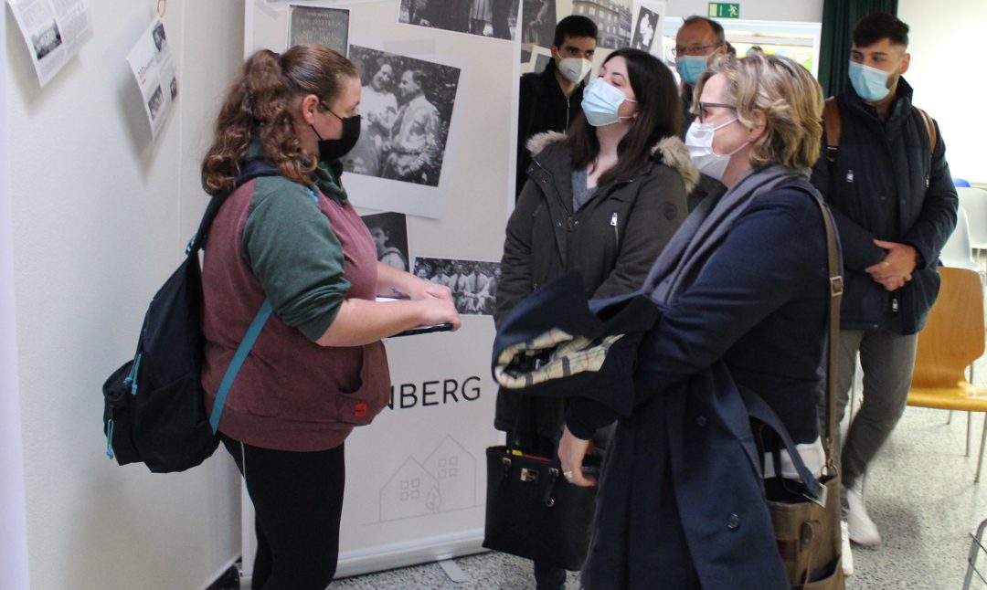 Abschließend erzählte der Vorsitzenden des Heimatverein Dingden Heinz Wolberg, wie es zu der Ausstellung kam: Der Heimatverein kaufte ein leerstehendes altes Haus. Bei den Renovierungsarbeiten ab 2001 tauchten hinter Tapeten und Deckenverkleidungen immer mehr Erinnerungen an die jüdische Familie Humberg auf, die dort lebte, bevor sie durch die nationalsozialistische Verfolgung zerstört wurde. Dazu gehörten nicht nur Wandmalereien und Zeitungsreste an den Wänden, sondern sogar eine vollständige Hängevorrichtung für Vieh der ehemaligen Metzgerei der Familie. Der Heimatverein entschied, das Humberghaus zu einem Geschichtsort zu machen, an dem Schüler*innen die Familie Humberg, ihr Leben und ihr Schicksal greifbar erfahren können.