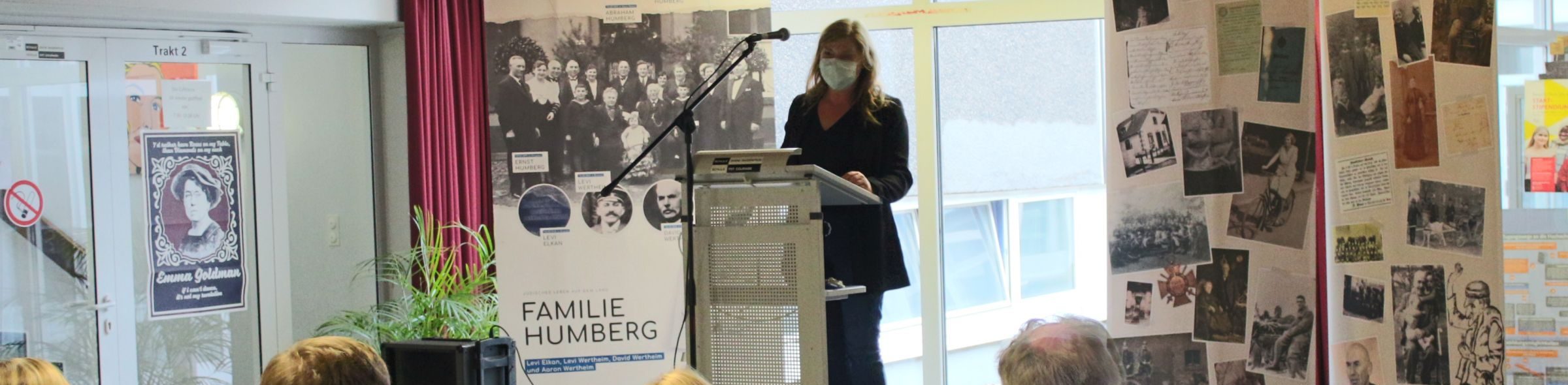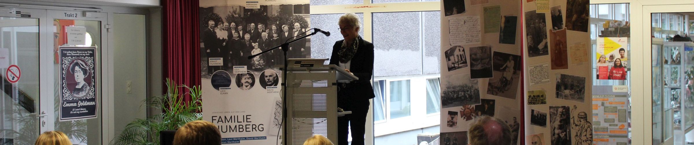 Bürgermeisterin Martina Rudowitz bedauerte, dass das jüdische Leben vor 1933 viel zu selten in den Blick genommen werde. Deshalb freute sie sich über das große Interesse der vielen gespannt lauschenden Studierenden im vollbesetzten Foyer der Schule. Sie forderte alle auf, Verantwortung für heutige gesellschaftliche Entwicklungen zu übernehmen, um das Pflänzchen der Demokratie zu schützen.