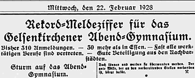 Nach dem Vorbild der ersten, in Berlin von A. Silbermann gegründeten Abendschule, an der berufstätige Erwachsene das Abitur erlangen können, wird auch in Gelsenkirchen ein Abendgymnasium errichtet. 310 Bewerberinnen unterziehen sich einer Aufnahmeprüfung. Ostern 1928 beginnt der Unterricht mit 80 Studierenden in zwei Klassen.