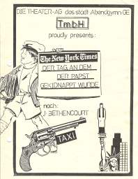 Mit der Aufführung des Stücks „Der zufällige Tod eines Anarchisten" von Dario Fo am 30.06.1988 präsentiert sich erstmals die Theater-AG des Abendgymnasiums, die sich „Theater mit beschränkter Haftung" (TmbH) nennt.