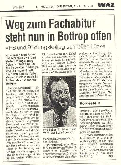 Das Land NRW beschließt das "Gesetz zur Modernisierung der Weiterbildung". Einrichtungen des Zweiten Bildungsweges führen seit dem Einführungserlass vom 27.02.2000 die Bezeichnung "Weiterbildungskolleg". Weiterbildungskollegs vereinen die bisher getrennten Bildungsgänge Abendrealschule, Abendgymnasium und Kolleg.