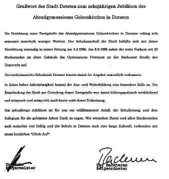Mit einer Festveranstaltung und einem anschließenden Schulfest am 21.08.1998 begeht das Abendgymnasium Gelsenkirchen sein 50-jähriges Bestehen.