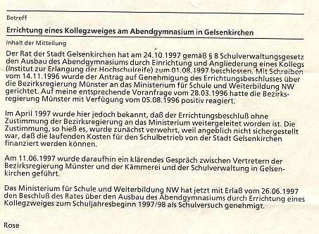 Nachdem die Schulkonferenz des Abendgymnasiums die Errichtung eines Kollegzweiges beschlossen und die Stadt Gelsenkirchen am 24.10.96 zugestimmt hat, erteilt das Ministerium für Schule und Weiterbildung am 26.06.97 ihre Zustimmung zum Schulversuch. Mit dem Wintersemester 1997/98 beginnt der erste Kurs (KS 1).