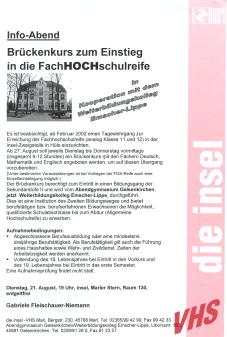 Kooperation zwischen dem Weiterbildungskolleg Emscher-Lippe Gelsenkirchen und der insel/VHS Marl. Das gemeinsame Angebot ist ein FHR-Kurs für berufstätige oder berufserfahrene Erwachsene in Vormittagsform. Aber auch Jugendliche, die noch keinen Ausbildungsplatz gefunden haben, können am Kurs teilnehmen, sofern sie in einem der Schulabschlusskurse der insel/VHS Marl oder einer anderen Weiterbildungseinrichtung die Fachoberschulreife erworben haben.